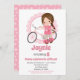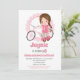Die Einladung dieses Mädchens zum Geburtstag beinhaltet ein niedliches braunes Haarbild mit ihrem rosa Fahrrad. Auf rosa-weißem niedlichem Jakobsakzent mit Punkten und Mädchen auf der Rückseite.