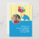 Niedliches und farbenfrohes Foto. Großartig deine kleinen Kinder. Ideal zum ersten Geburtstag. Kann auch für zweite und dritte Geburtstagsparty angepasst werden. Ein Elefant hält Ballons und trägt einen Geburtstagshut. Fügen Sie Ihr eigenes Foto, Ihre Formulierung und Ihr Kind Alter hinzu. Niedliche Formulierung auf der Vorderseite und Party Details auf der Rückseite.