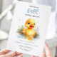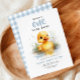 "Eine glückliche Ente" Einladung zum ersten Geburtstag mit einem niedlichen Entlein und einem gingham-Gingham-Muster-Hintergrund.