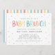 Farbenfrohe Regenbogenbabylbrunch-Einladung. Ideal für kleine Mädchen, Jungen, Überraschungen oder Gender, die Babydusche aufdecken. Mit seinem fröhlichen, farbenfrohen Design mit Streifen und Polka-Punkten ist dieser zeitlose Klassiker sicher, gut in Ihr Party aussehen. Teil einer kodierenden Konstruktion.