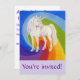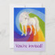 Hübsches Einhorn umgeben von einem Regenbogen lädt zu einer Geburtstagsfeier ein.