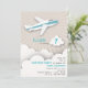 Eine Geburtstagsfeier-Einladung mit einer Illustration eines weißen Flugzeugs mit blauem Streifen über den Wolken. Personalisieren Sie den Text.