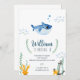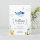 Geburtstagsfeier mit einem Thema unter dem Meer für die Geburtstagsfeier eines Kindes. Diese Einladung enthält einen niedlichen Babyhai in Aquarellfarbe, der von Hand gemalt wird, und nautische Elemente als Anker. Ideal für eine Kinder-Geburtstagsparty.