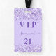 Ein modernes, stilvolles und glamouröses Abzeichen für eine 21. Geburtstagsfeier (oder jedes Alter). Violett mit violettem, lavendelfarbenem Konfetti. Mit dem Text: VIP. Personalisieren und hinzufügen von Name, Alter, Adresse/Datum. Der Name wird mit einem modernen handgeschriebenen Stilskript mit Swashes geschrieben. Um die Swashes behalten, löschen Sie nur den Beispielnamen, verlass die Leerzeichen oder Emoji's vor und nach dem Namen.