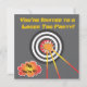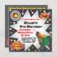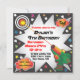 Super-Spaß Laser Tag Geburtstag Einladung mit bunten Laserpistolen Schießen auf ein Bullseye-Ziel mit coolen Comic Buch-Sternexplosionen und Wolke Gedanken Blasen. Anpassbar an Ihre Bedürfnisse. Handgezeichnete Abbildung von McBooboo.