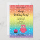 5" x 7" Einladung mit niedlicher rosa Eule mit weißen Polka-Punkten verblassen Regenbogenherzen mit rotem, orangefarbenem, gelbem, grünem, blauem und lila Muster Hintergrund mit Imitaten pink Glitzer cupcake, Schokoladenkuchen und einer Roten Kirsche auf einer Eule-Thema Geburtstagsparty laden