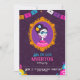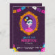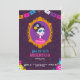 Wohnung Einladung zum Tag der Toten. Einladung mit einem Portrait eines toten Mädchens und mit mexikanischen Farben und Fahnen im Cartoon-Stil.