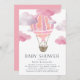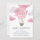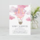 Feiern Sie Ihr kleines Mädchen unterwegs mit dieser süßen Babydusche-Einladung in sanften Pastellfarben. Das Design zeigt eine Heißluftballondarstellung in pfirsichfarben und rosa, umgeben von rosa und grauen Wolken, und Ihre Veranstaltungsdetails befinden sich unter rauchblauen grauen Buchstaben.