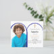 Fügen Sie Ihr eigenes Foto in vertikaler Größe hinzu. Ein marineblau bogenförmiger Rahmen aus Foto. Eine weiße Hintergrundfarbe. Personalisieren und fügen Sie einen Namen und Details. 1 Blatt = 1 Einladung mit Druckkante bis Kante.