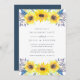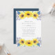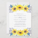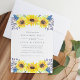 Unsere Einladung zur Begegnung mit Blumenfeldern umgibt Ihre Verlobung-Fest-Details mit Haufen von gelben Aquarellsonnenblumen, blauen und lila Knospen und grünem Blattwerk. Eine süße Wahl für Hochzeitsfeiern im Sommer oder Herbst in rustikalen Outdoor- oder Landschaften.