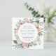 Unsere Blumenzelleneinladung in einem einzigartigen quadratischen Format umrahmt Ihre Hochzeitsdetails mit einem Kreis von bemalten Aquarellfarben-Rose, Peonies in Hydrangeas in kuscheligen Pastelltönen aus Rosa, Pfirsich, Elfenbein und Salbei Grün.