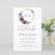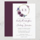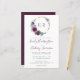 Dieses Hochzeitsdesign zeigt die Monogramm-Initialen der Braut und des Bräutigams in dunklem, lila, durch einen Aquarellkranz violetter Blumen auf einem vergoldeten Imitat-Folienkreis gerahmt. Personalisieren Sie den Text mit den Namen der Paare in eleganter, dunkler lila Handschrift und den Hochzeitsdetails in Holzkohle grau. Auf der Rückseite ist ein kräftiger Schatten von dunklem lila.