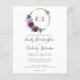 Dieses Hochzeitsdesign zeigt die Monogramm-Initialen der Braut und des Bräutigams in dunklem, lila, durch einen Aquarellkranz violetter Blumen auf einem vergoldeten Imitat-Folienkreis gerahmt. Personalisieren Sie den Text mit den Namen der Paare in eleganter, dunkler lila Handschrift und den Hochzeitsdetails in Holzkohle grau. Auf der Rückseite ist ein kräftiger Schatten von dunklem lila.