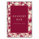 Dies ist ein Bild im Vintage-Stil mit einer eleganten Einladung zur Dessertbar. Der Hintergrund zeigt komplizierte rote Blumenelemente auf einer cremefarbenen Fläche und schafft eine anspruchsvolle und einladende Atmosphäre. In der Mitte kündigt ein tiefes, maronenfarbenes Rechteck mit weißem Text in fetten Buchstaben "DESSERTBAR" an, gefolgt von dem charmanten Satz "BITTE NIMM EINEN GENUSS!". Es strahlt Wärme und Gastfreundschaft aus und ist perfekt, um jeder Veranstaltung oder Zusammenkunft einen Hauch von Klasse zu verleihen.