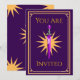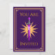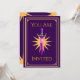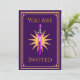 Eine magische Geburtstagseinladung mit violettem Schwert, perfekt für einen 5-jährigen Helden. Ideal für Fantasy-Krieger-Partys und epische Kinderfeiern. Bearbeitbarer Text für Namen, Datum und Party-Details.