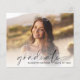 Elegante, preisgünstige Graduiertenparty mit dem Foto des Absolventen, überlagert mit "Graduate" in einem modernen Drehbuch und ihrem Namen und Klassenzimmer in einfacher Typografie. Auf der Rückseite fügen Sie die Details der Graduierungsparty hinzu.
