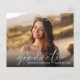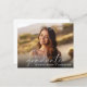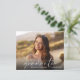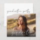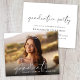 Elegante, preisgünstige Abschlussfeier mit dem Foto des Absolventen in einem schicken, modernen, weißen Drehbuch und ihrem Namen und Klassenjahr in schlichter weißer Schrift. Auf der Rückseite, fügen Sie Ihre Abschlussfeier Details. Dieses halbglänzende Haushaltspapier ist gewichtsähnlich wie Foto. Es ist auch eine größere 12x18-Kartenversion verfügbar (für den Link die Meldung).