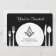 Moderne Freemason Einladung, die eine Touch der Eleganz zu Ihrem maskischen Abendessen zu einem Event der Gemeinschaft hinzufügen wird! Diese benutzerdefinierte Karte kann personalisiert werden und funktioniert gut mit der jährlichen Installation von Officers und anderen Lodge-Events. Diese individuell gestaltete Karte verfügt über den Platz und den Kompass der Freimaurerei, sowie über eine Tafel und Silbergeschirr (Gabel, Messer, Löffel). Farben: schwarz und weiß.