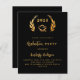 Schwarzer Hintergrund. Ein klassischer Lorbeerkranz und eine Graduierenkappe. Personalisieren Sie das Jahr, den Namen und die Details. Goldener Text. 1 Blatt = 1 Einladungs-Druckkante.