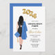 Graduation Party Einladung weibliches Portrait zeichnend schwarzes Kleid, blaue Kappe und Kürbis, lange dunkle Haare. 2023 Goldballons.