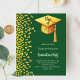 Eine moderne, elegante Graduation Party Einladung. Ein smaragdgrüner Hintergrund mit goldenen Imitaten Konfetti und einem großen goldenen Graduierdeckel mit Tassel. Personalisieren und fügen Sie einen Namen und Party-Details hinzu. Weißer Text. 1 Blatt = 1 Einladung mit Druckkante bis Kante.