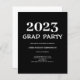 Einfache Einladung zur Budgetgraduierungspartei. Einfach Informationen von der Produktseite hinzufügen. Weiße Typografie auf schwarzem Hintergrund. Das Blatt Papier ist dünner als das Kartenpapier.