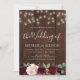 Rustikaler Holzhintergrund mit bordeauxroten Aquarellfarben-Blume und weißem Skripttext.