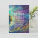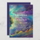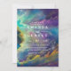 Schöne Hochzeitseinladung mit einem wunderschönen hellen Himmel im Hintergrund in einer Kombination aus gelben, blauen und lila Farben.