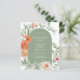 Dieses romantische Hochzeitsdesign besticht durch eine schlanke, grüne Bogenform, die von herrlichen pfirsichfarbenen Blume und grünem Blattwerk gerahmt ist. Personalisieren Sie die Einladung mit den Namen der Braut und Bräutigam in einer Kombination aus Serif und Sans Serif Typografie und die Hochzeitsdetails in sans serif und italics. Die Rückseite ist ein fester Schatten von Salbei grün. Ideal für eine Hochzeit im Frühling oder Sommer.
