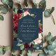 Unsere Hochzeitseinladung von Radiant Bloom umgibt Ihre Hochzeitstage-Details mit einem geometrischen Rahmen von bemalten Aquarellfarben-Blume in bordeauxroter Marsala, Rosa und Marineblau, mit grünen botanischen Blattwerk und Eukalyptus-Blätter auf einem reichhaltigen marineblauen Hintergrund. Eine schöne Wahl in üppigen, gesättigten Farben für Herbst- oder Winterhochzeiten.