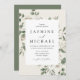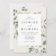 Die elegante, weiße Blumen-Hochzeitseinladung enthält Ihre Namen und Hochzeitsdetails, gerahmt von gemalten Aquarellfarben Eukalyptus-Blätter, üppigem Grün, Rose in Weiß und Creme und lisianthus-Blume.