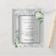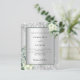 Imitate silberfarbener Hintergrund mit weißen Blumen, Blume, Eukalyptusgrün und Imitaten silberne Glitzer, Glitzern. Personalisieren und fügen Sie Ihre Namen und Hochzeitsdetails. Schwarze Buchstaben.