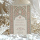 Diese Hochzeitseinladung ist ein zartes Gleichgewicht aus rot-rosa und schlaugrün, inspiriert durch die komplizierten Muster der islamischen Spitze. Die Einladung vereint traditionelle Kunst mit modernem Design und besticht durch eine schlanke grüne Umgebung mit blühenden, geometrischen Spitzen-Mustern, die an das verzierte Detail der islamischen Architektur erinnern. Der architektonische Bogen auf der Vorderseite umrahmt die Veranstaltung in einem eleganten Drehbuch, Set vor einem cremigen Hintergrund, der die Farbtöne ergänzt. Die Rückseite der Einladung spiegelt dieses Design wider und bietet einen harmonischen Hintergrund für zusätzliche Veranstaltungsinformationen oder eine personalisierte Botschaft an Ihre Gäste. Diese Einladung ist ideal für Paare, die eine anmutige und kulturell reiche Ankündigung für ihren Hochzeitstag suchen.