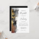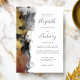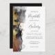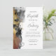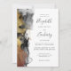 Der links Rand dieser eleganten, modernen Hochzeitseinladung zeichnet sich durch eine fließende abstrakte, goldfarbene und schwarze Tinte aus. Der individuell anpassbare Text kombiniert handgeschriebene Holzkohle, Kupferplatte und kursiv Schriftart auf weißem Hintergrund. Der Rücken ist schwarz und massiv.