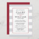 Unsere Metro Stripe Hochzeitseinladung verbindet moderne und traditionelle Elemente und bietet klassische Stilelemente in einer eleganten Farbpalette aus Cranberry rot und Blassgrau mit knusprigen schwarzen Buchstaben. Breite horizontale Streifen in grau und weiß rahmen Ihre Hochzeitsdetails in einer Mischung aus modernen Block und traditionellen Schriftzeichen. Ein dünner Rahmen in Rot sorgt für einen unerwarteten Kontrast für einen Pop der Farbe. Karten werden in rotes Rot umgeschaltet. Ideal für Hochzeiten im Winter oder in der Ferienzeit.