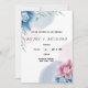 Blue Blume Wedding Invitation ist eine einzigartige und moderne, blaue, rosa und weiße Hochzeitseinladungskarte, die auf weißem Hintergrund zu sehen ist und ein schlichtes und kreatives Textlayout aufweist, das sich sicher bemerkbar macht.