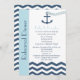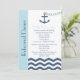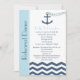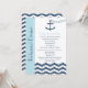 Dieses moderne nautische Probe-Dinner wird in Blautönen gehalten. Ein Anker mit einer Herzkette ist der Brennpunkt. Die Namen der Braut und des Bräutigams erscheinen unter dem Anker. Ein kleines Gedicht erscheint als Nächstes mit der ganzen Probe Abendessen laden Details unten. Am unteren Ende der Einladung befindet sich ein Zickzack Zickzackmeer, um eine lustige Touch hinzuzufügen. Eine große Einladung für ein nautisches Probe Hochzeitsessen. Copyright henishouseuse paper