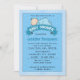Gemütliche Einladung mit einem Baby-Baby-Baby-Junge in blauen Schlafanzügen. Der Hintergrund sind blaue Punkte und blauer Gingham. Die Rückseite der Einladung hat blaue Babyfüße. Fügen Sie Ihre Party-Daten mit unserer einfachen Vorlage hinzu.