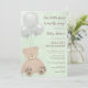 Ein kleiner Bärenkub auf der Art und Weise Babydusche Einladung mit Aquarellbärchen und Ballons in geschlechtsneutralem Braun und Grün. Die Rückseite des Einladens hat diagonale Wasserfarbenstreifen und Babyblöcke.