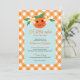 Feiern Sie eine Babydusche mit dieser süßen kleinen Süsse Orange Neutral Baby Dusche Einladung. Diese Kollektion ist perfekt für eine Zitrusdusche, geschlechtsneutral und sommerlich. Das Design besteht aus einem niedlichen, illustriert orangefarbenen Charakter mit koordinierenden Blume und Blätter, einem orangefarbenen Gingham und einem weichen, blau geschmolzenen Hintergrund.