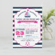 Navy und weiße Streifen Print Hintergrund mit Segelboot und Life-Saver Float nautische twin Mädchen Baby Dusche Einladungskarte.