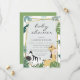Niedlicher und stilvoller Wald mit Tieren Baby Dusche Einladung. Das Design zeichnet sich durch große Blätter-Rahmen, doppelten goldenen Innenrahmen mit einem Zebra und Giraffe am unteren Rand aus. Die Rückseite des Einladens ist grün und weiß diagonal Streifen. Personalisieren Sie diese Einladung mit Ihren eigenen Babydusche Details in geschmackvollen rauchgrauen Schriftzeichen, die mit dem Schriftart im Skriptstil kombiniert sind.