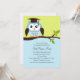 Niedliche Kinder-Abschlussfeier mit einer blauen Eule, die auf einem Zweig sitzt. Der untere Teil der Einladung ist blau, der obere ist grün. Grafik ©Babystar Design.