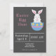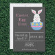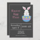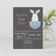 Eine individuelle Einladung für eine Ostereierjagd mit einer Illustration eines Hasen mit rosa Ohren aus einem blauen Ostereier, das mit Blume dekoriert ist! Auf der Rückseite ist ein gelbes Küken aufgedruckt! Es wird leichter sein, die Einladungen an Ihre Ostereierjagd zu schicken.