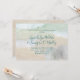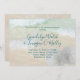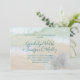 Hochzeitseinladungen mit zwei Sand-Dollar und Strand-Szene Hintergrund. Dunkelblau-grüner Text beginnt mit "Du bist zur Hochzeitsfeier eingeladen, die dich verbindet" mit Namen des Paares in überdimensionalem Skript. Der Rest der Zeremonie wird in einem Absatz gedruckt. Der Hintergrund ist Meeresschaum, der an Land kommt, mit zwei weißen Sand Dollar in der unteren rechten Ecke. Dieses Design kommt auch als sofortiger Download.