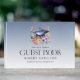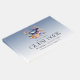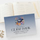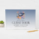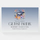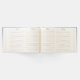Dieses Abschluss Gästebuchdesign besaß einen Gradhut mit einem Blumenkranz auf einer blau-weiß-farbigen und anpassbaren dunkelblauen Typografie. Ideal für Ihre Gäste, um sich bei der Feier Ihres Abschlusses anzumelden.