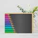 Dieses Design ist Bleistifte an einer Tafel. Es hat einen Stapel farbiger Bleistifte auf einer Seite mit einer schwarzen Tafel im Hintergrund. Diese Stifte auf einer Tafel Design sieht gut auf dieser Einladung