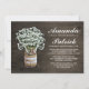 Gipskraut Burlap Engagement Party Einladungen - bietet ein Baby Atem Blumenarrangement in einem Maurerglas mit Burlap, Spitze und Zwirn über einem rustikalen Stallholz Hintergrund dekoriert. Sehen Sie sich die passenden Produkte in diesem Design über die Sammlung auf dieser Seite.