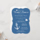 Elegante Brautdusche aus der Marine in Blau und Weiß. Gewohntes Hochzeitsfest Party lädt mit kleinen weißen Herzen ein. Anpassen der Form. Benutzerdefinierte Hintergrundfarbe. Schöner, stylischer Skripttext mit Vintagem Bootanker. Design zum Thema Seeschifffahrt Ideal für Strand und Hochzeiten in Urlaubsort