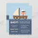 Eine niedliche Segel-Junge Wassersport-Babydusche, die perfekt für die Mama, wer erwartet ein Baby-Junge! Es hat einen niedlichen kleinen Seemann mit einem Kapitän, der in einem Segelboot sitzt, das mit Rädern und einem Gelb-Weiß-Streifen Segel ausgestattet ist. Pastellblaues Polka-Punktmuster für den Hintergrund. Personalisieren Sie einfach mit Party Details.